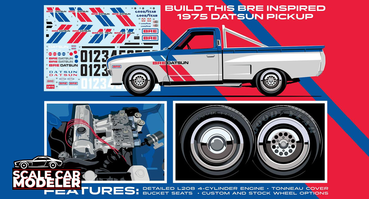 MPC (aka Round2 Models has announced a super exciting new release - the 1975 BRE Datsun 620 Pickup kit in 1/25 scale. This mini-truck kit has the option to be built as a stock 620 or with the full BRE treatment - wide-body fenders, while wheels and tires, front spoiler and a bed-mounted rollbar, to name a few options.