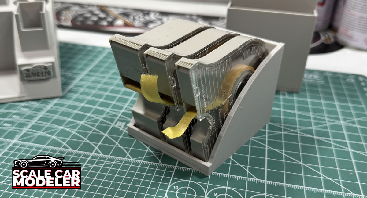 Part 2 - The Tape Holder: this piece has 3 compartments and is designed to securely hold all 3 sizes of Tamiya's tape dispensers - 6mm, 10mm and 18mm.